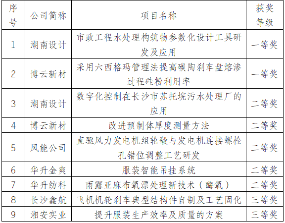 近日,興湘集團所屬湖南設計、博云新材等9項質量創新成果摘得“湖南省第五屆質量創新大賽”一等獎2項、二等獎5項、三等獎2項。興湘集團所屬企業此次參賽項目在建筑、新材料、新能源、服裝紡織等領域多點開花,覆蓋質量攻關改進、質量管理數字化、六西格瑪等所有類型,培育出一大批“質量標桿”“創新團隊”,取得了較高的經濟社會效益和技術推廣價值。獲獎名單如下: