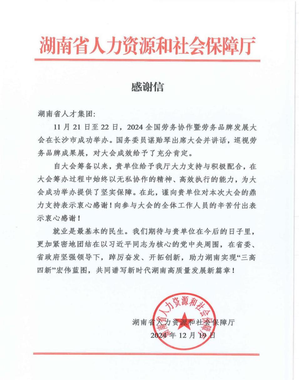 12月19日,湖南省人才集團收到省人社廳寄來感謝信,對省人才集團在2024年全國勞務協作暨勞務品牌發展大會籌備工作中給予的無私協作、高效執行予以積極評價。省人社廳表示,期待今后與省人才集團共同譜寫新時代湖南高質量發展新篇章。這是省人才集團最新收到的就業保障工作“朋友圈”點贊。