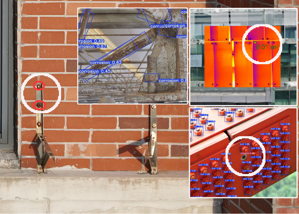 答:可以。像女兒墻、裝飾線條、廣告牌、支架等附屬構(gòu)件,系統(tǒng)能排查它們的裂縫、銹蝕、螺栓缺失、脫落等安全隱患。比如在某商務(wù)樓巡檢中,就精準(zhǔn)鎖定了7層一處高危空調(diào)外機(jī)支架,智能判定其為“紅色緊急”風(fēng)險(xiǎn)(墜落概率>65%),維修人員依據(jù)定位迅速處置,現(xiàn)場(chǎng)確認(rèn)支架內(nèi)部銹蝕深度達(dá)40%且螺栓斷裂——該系統(tǒng)成功在事故發(fā)生前高效定位并拆除了這顆“懸頂之劍”,避免了事故發(fā)生。