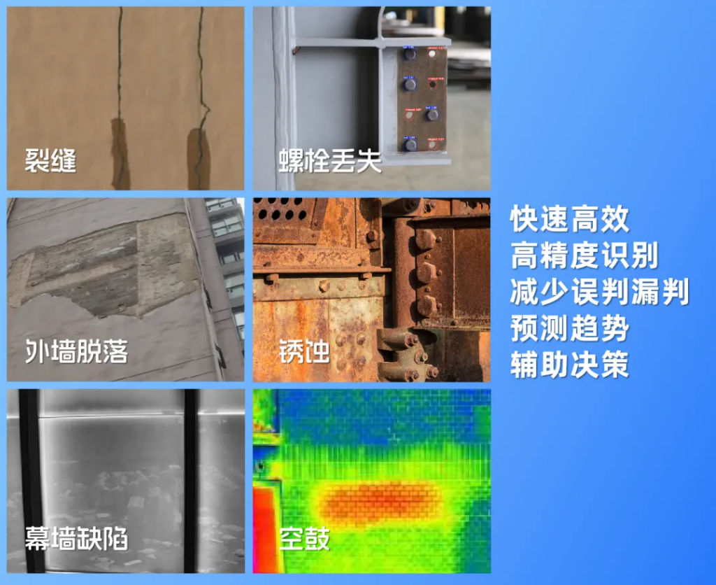 答:它能解決外圍護(hù)系統(tǒng)很多常見“病害”識(shí)別難題,比如裂縫、空鼓、滲漏、脫落、材料老化和連接件失效/缺失等,這些都是可能導(dǎo)致“天上飛來橫禍”的隱患。