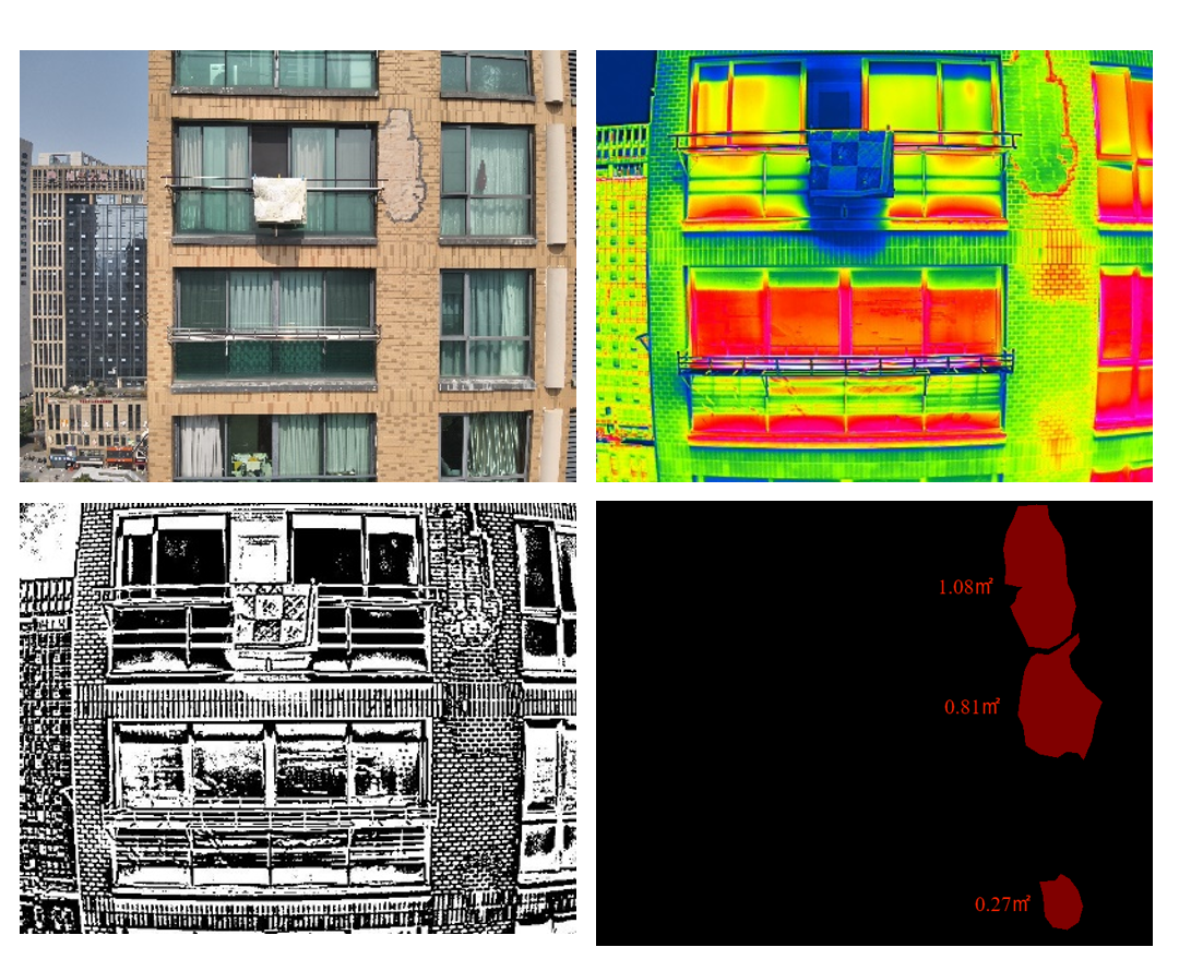 答:用紅外熱成像儀。簡(jiǎn)單來說就像給外墻做“CT 掃描”,結(jié)合算法來解決這個(gè)問題。這種方法不用接觸建筑物表面,也不用搭建腳手架,很方便。無人機(jī)采集的數(shù)據(jù)經(jīng)系統(tǒng)分析后,能自動(dòng)識(shí)別空鼓位置、進(jìn)行面積統(tǒng)計(jì)和空鼓率測(cè)算等,還會(huì)生成帶風(fēng)險(xiǎn)等級(jí)評(píng)估的缺陷分布圖。